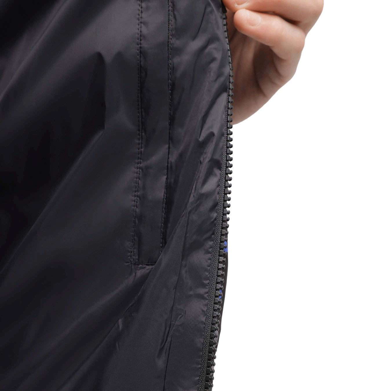 La caratteristica distintiva è la stampa all-over a fantasia geometrica che copre l'intera superficie. I colori dominanti sono il Nero, con grafiche in Blu Elettrico e Grigio Chiaro/Antracite, che creano un effetto visivo dinamico e moderno. La giacca ha una chiusura a zip intera e polsini elastici per trattenere il calore.