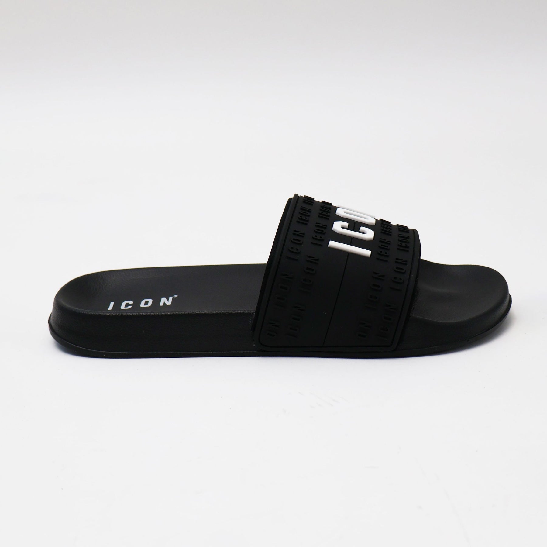 Maxi Logo ICON: La fascia superiore è dominata dalla scritta "ICON" in bianco a contrasto, un dettaglio che rende queste slide un vero status symbol dello streetwear di lusso.