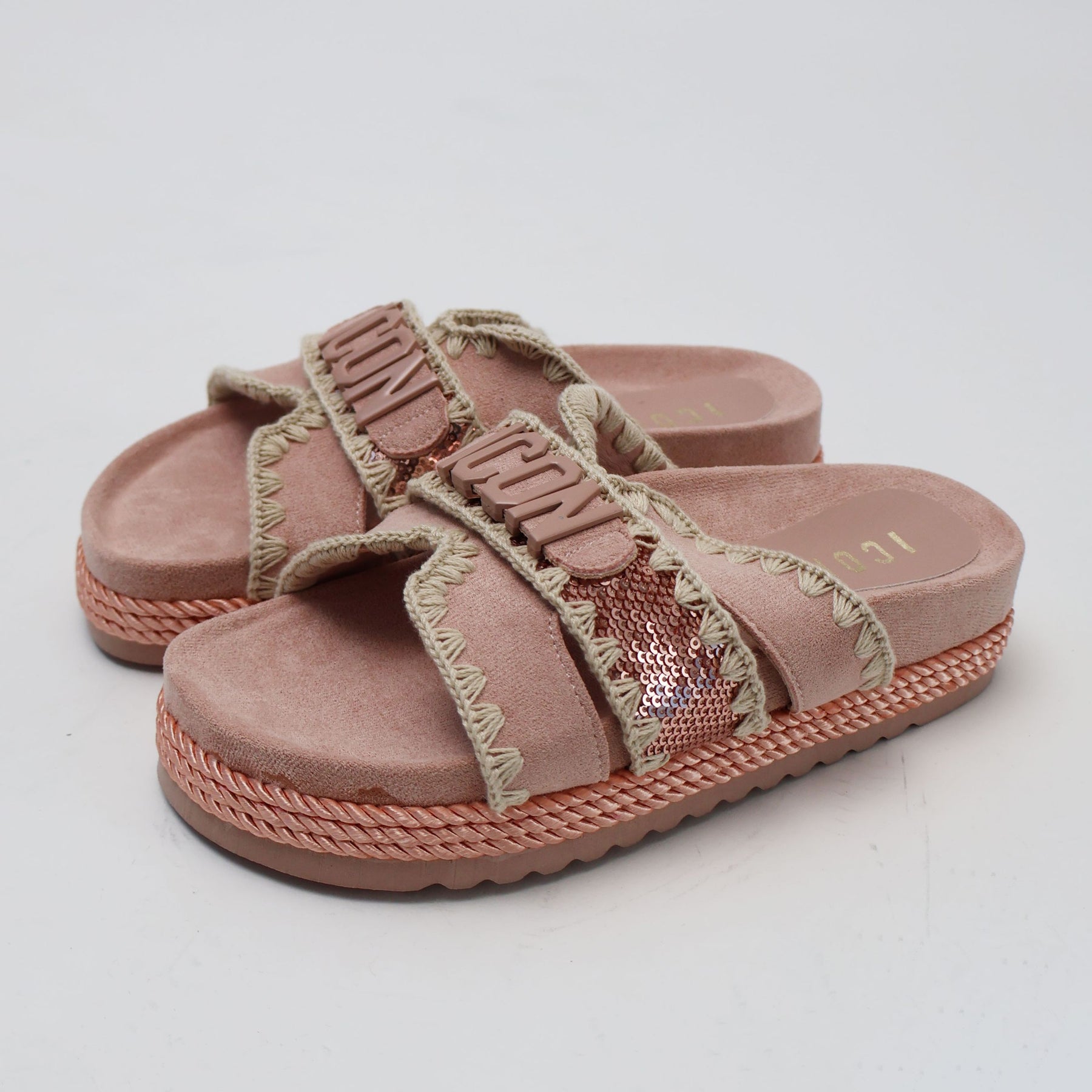 Sandali Icon con doppia fascia e logo a contrasto. Disponibili nei colori Rosa e Ghiaccio, taglie 36-41. Calzatura estiva versatile, leggera e confortevole per donna e ragazza.