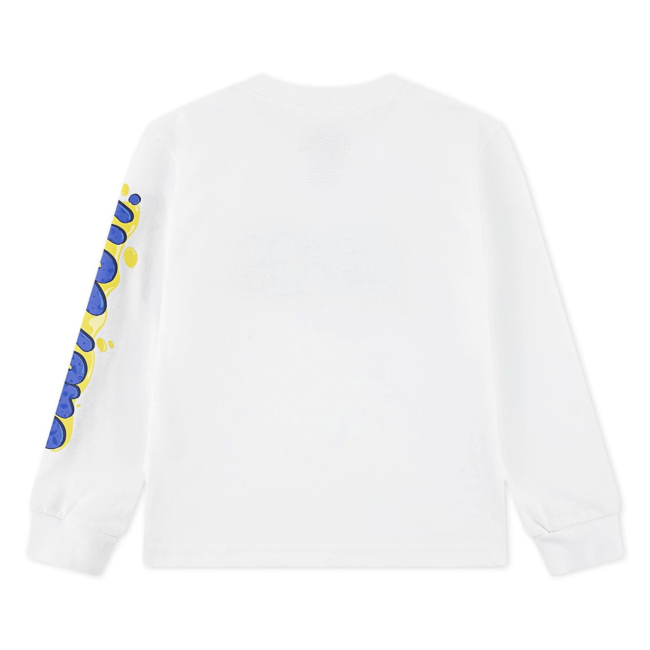 La maglia è realizzata in morbido cotone (o jersey, a seconda del modello specifico) in un classico colore bianco. La grafica centrale, ispirata allo stile street-art, presenta il logo NIKE in un audace carattere a bolle blu con contorni e schizzi gialli. Un piccolo Swoosh Nike blu è posizionato sotto la scritta principale.
