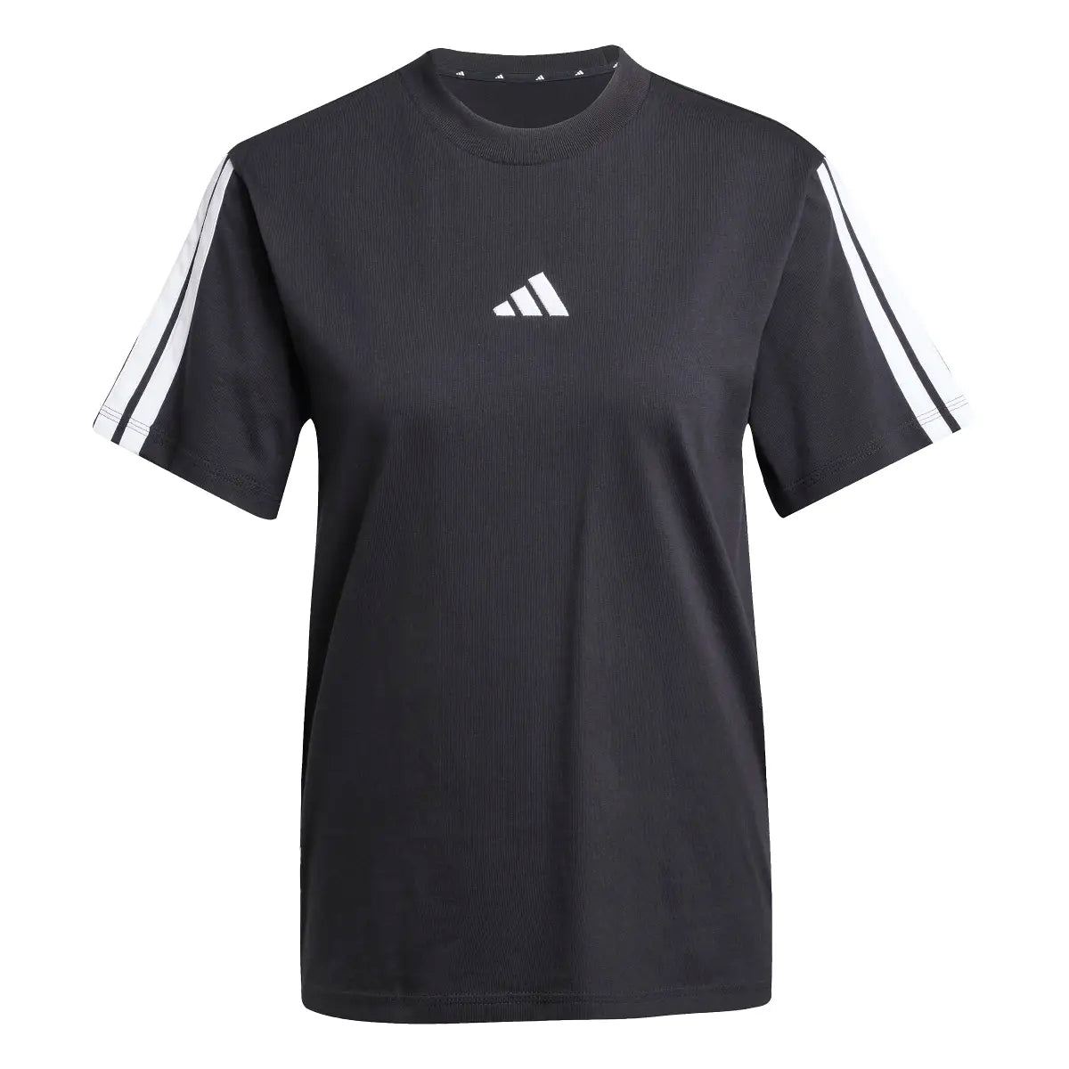 Adidas Essentials 3-Stripes Women's T-Shirt in Black. Soft cotton jersey t-shirt with iconic white three stripes on the sleeves. The original sporty style for your everyday look.