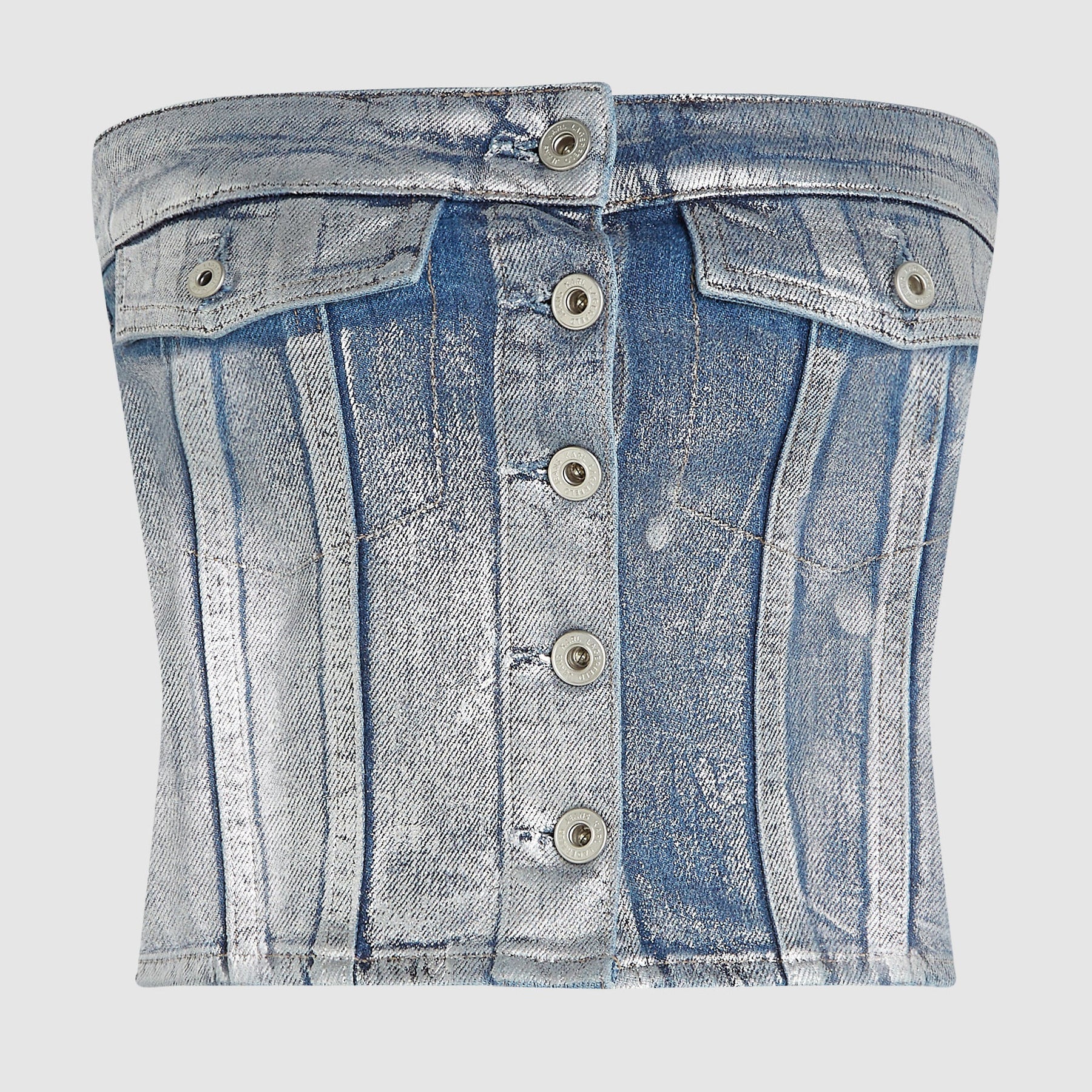 Top Karl Lagerfeld Jeans in Coated Blue finish. Contemporary design with a metallic coated effect, slim fit, and iconic logo. The futuristic touch for your denim wardrobe.
