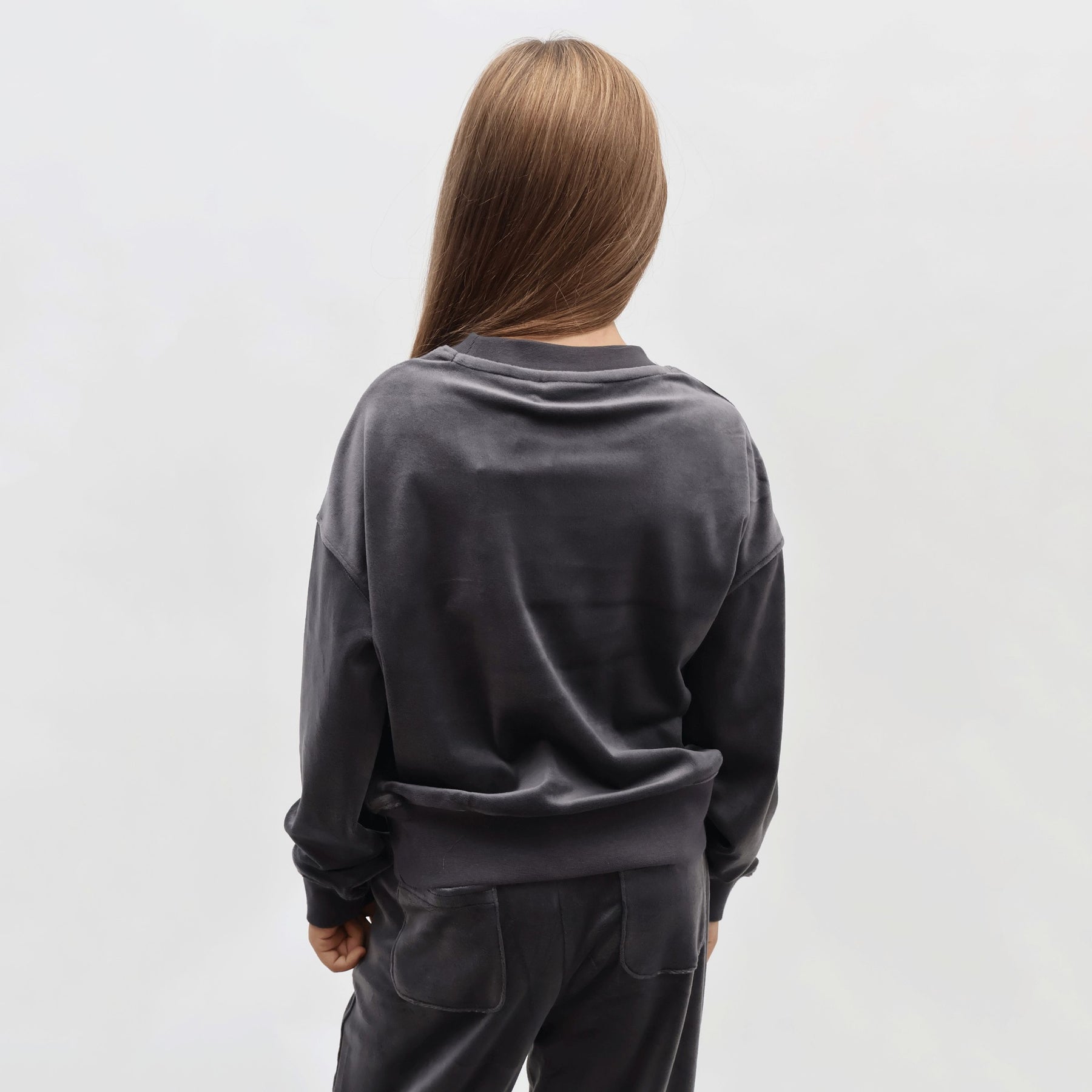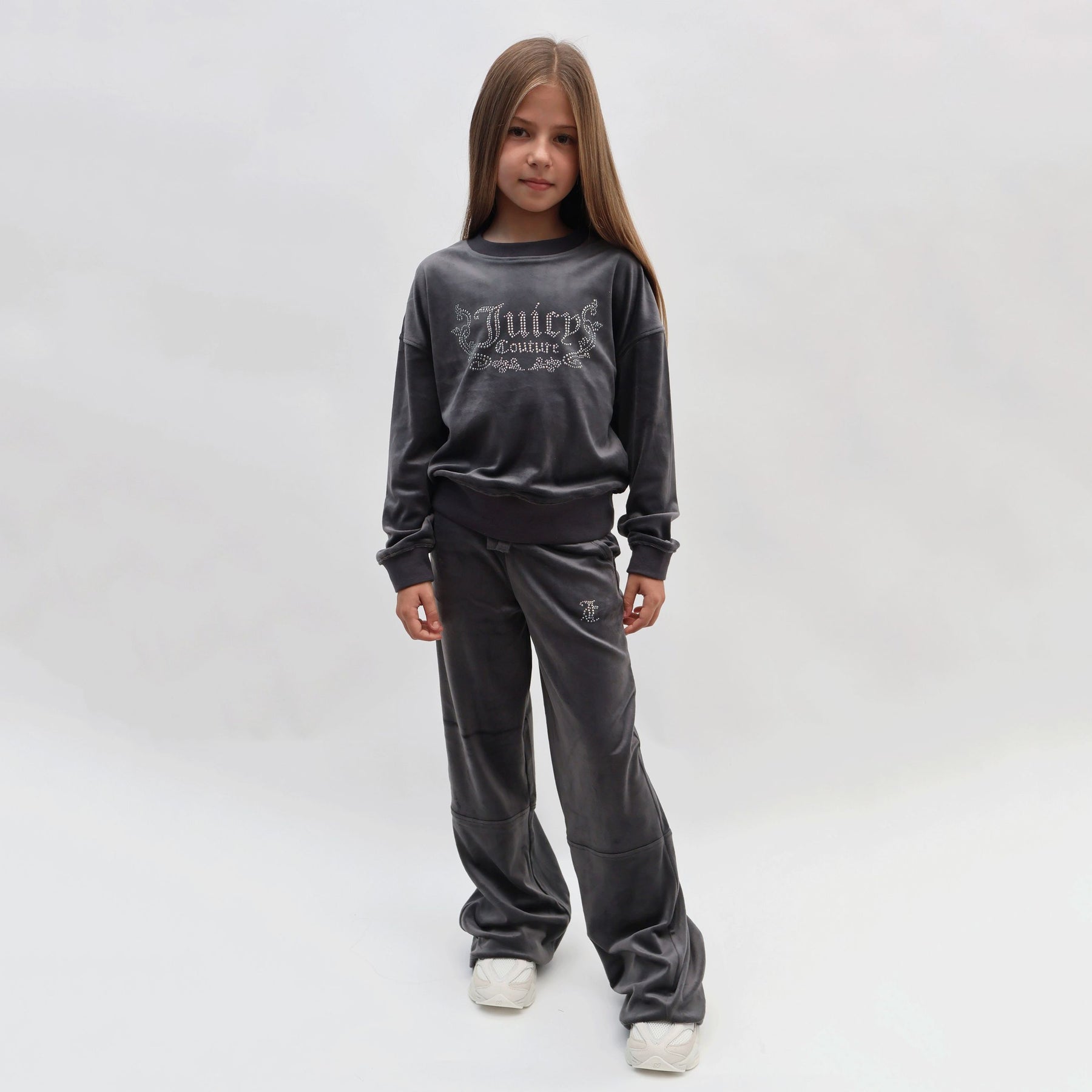 Realizzata nel lussuoso tessuto velluto (velour), è in un'elegante tonalità Blu Grigio (una sfumatura sofisticata tra l'azzurro polvere e il grigio). Il modello è una Full Zip Hoodie (felpa con cerniera intera e cappuccio), perfetta da indossare aperta o chiusa. La caratteristica principale è l'enorme logo "JUICY COUTURE" stampato o applicato sul fondo della schiena, impreziosito da brillanti strass (diamanti), che la rende inconfondibile e scintillante.